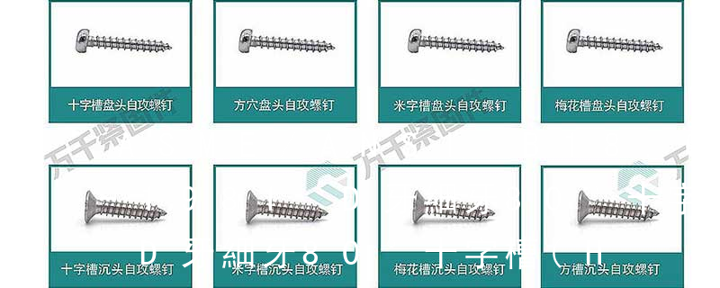 (鐵板牙自攻螺絲) B-2: Plastic Tapping Screw. (塑膠用,自攻螺絲) C: Wooden Screw : 木工螺絲 D: Drywall Screw :水泥墻螺絲 E: Self Drilling Screws鉆尾螺絲(不銹鋼鉆尾螺絲,復合材料鉆尾螺絲) F:膨脹螺絲,四片膨脹螺絲又