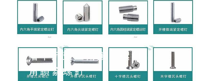 1.機螺釘 2.自攻螺釘 3.鉆尾螺釘 4.墻板釘 5.纖維板釘 6.木螺釘7.六角木螺釘 8.不脫出螺釘 9.組合螺釘 10.微型螺釘 11.家具螺釘 12.電子螺釘頭型:1.六角頭(hexagon head) 2.六角頭法蘭面(hexagon head with flange) 3.